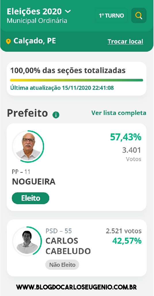 57,43% DOS VOTOS VÁLIDOS: NOGUEIRA É REELEITO PREFEITO DE CALÇADO