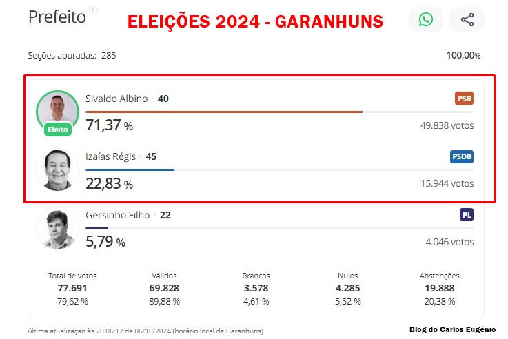 Ao se referir a diferença entre Ele e Sivaldo, 33.894 votos, que representou 48,54% dos votos válidos, Izaías comparou com o pleito de 2016, em que colocou uma vantagem de 28.964 (44,86% dos votos válidos) sobre Albino, e chamou a atenção para aumento de 3.634 votos válidos entre as eleições de 2016 e 2024.