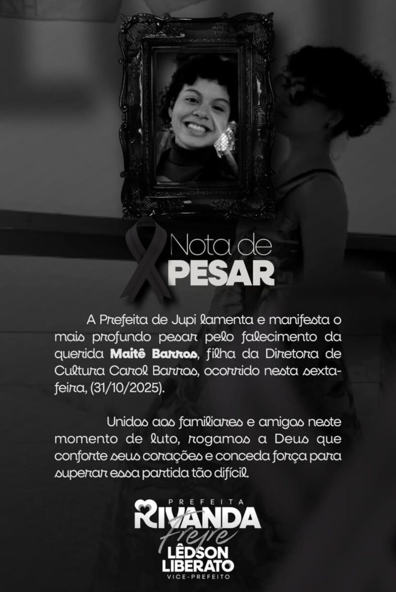 A morte da Adolescente foi confirmada pela Prefeita de Jupi, Rivanda Freire, cidade onde a adolescente morava, por meio de uma publicação nas redes sociais. Segundo a Prefeita, Maytê é filha de Carol Barros, diretora de Cultura do Município. “Unidos aos familiares e amigos neste momento de luto, rogamos a Deus que conforte seus corações e conceda força para superar essa partida tão difícil”, declarou Rivanda.