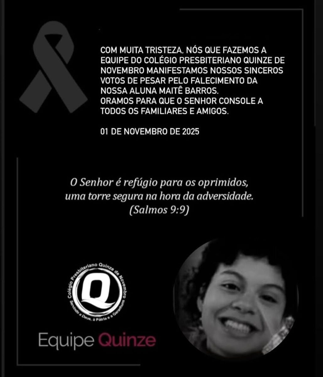 “Com muita tristeza, nós que fazemos a equipe do Colégio Presbiteriano Quinze de Novembro manifestamos nossos sinceros votos de pesar pelo falecimento da nossa aluna Maitê Barros. Oramos para que o Senhor console a todos os familiares e amigos”, publicou, nas redes sociais, o Colégio Presbiteriano XV de Novembro, onde Maytê Barros estudava. (@blogcarloseugenio)