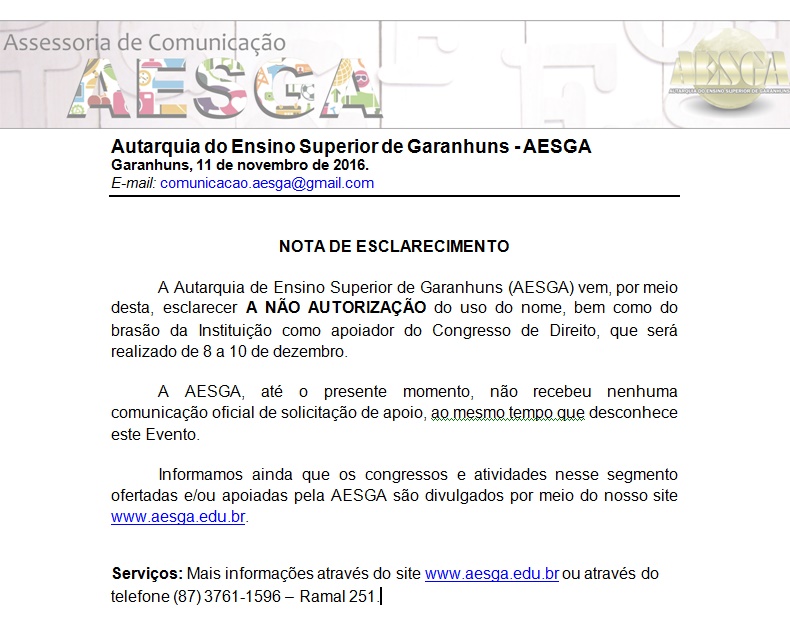 de Garanhuns (AESGA) emitiu Nota de Esclarecimento a respeito do Congresso de