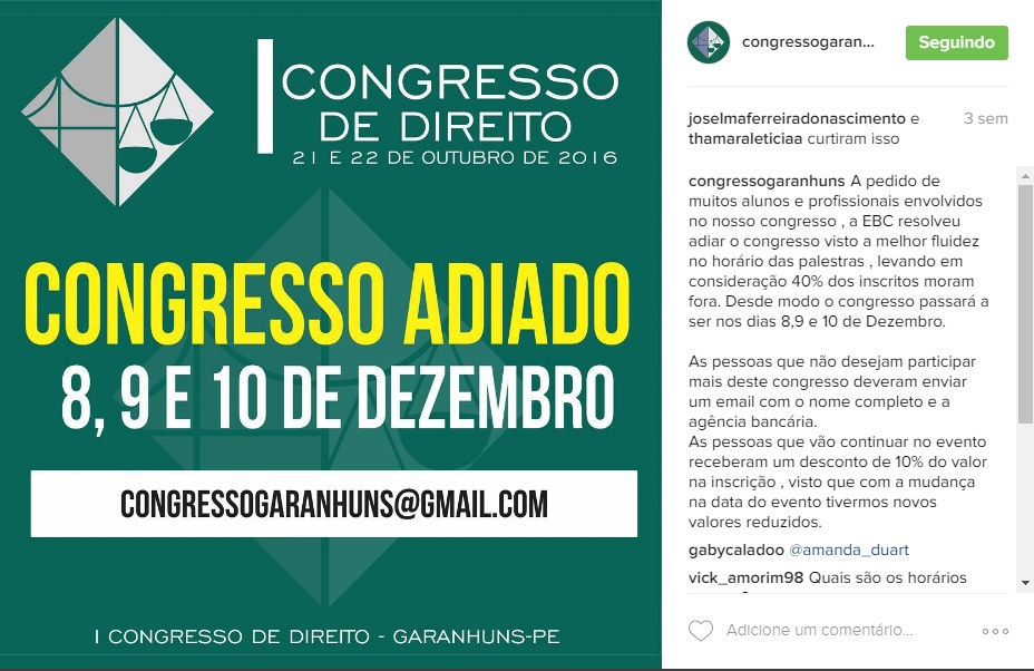 dias 21 e 22 de outubro, o Congresso de Direito foi adiado para os dias 8, 9 e