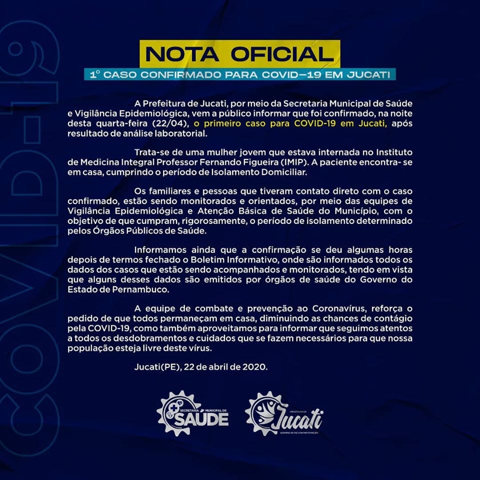 informou a confirmação do primeiro caso para COVID-19 em Jucati, após resultado