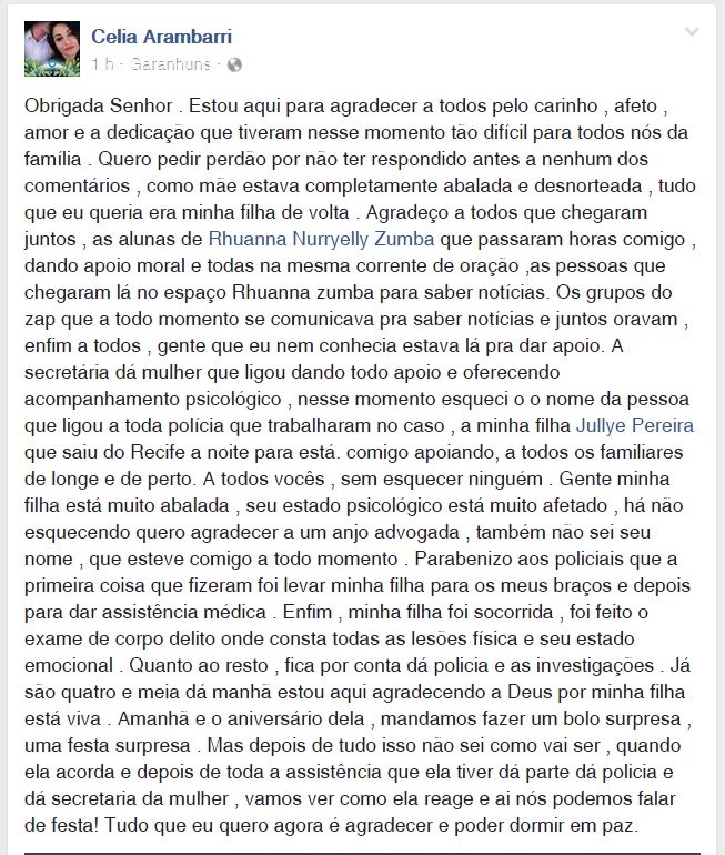 “Gente minha filha está muito abalada, seu estado