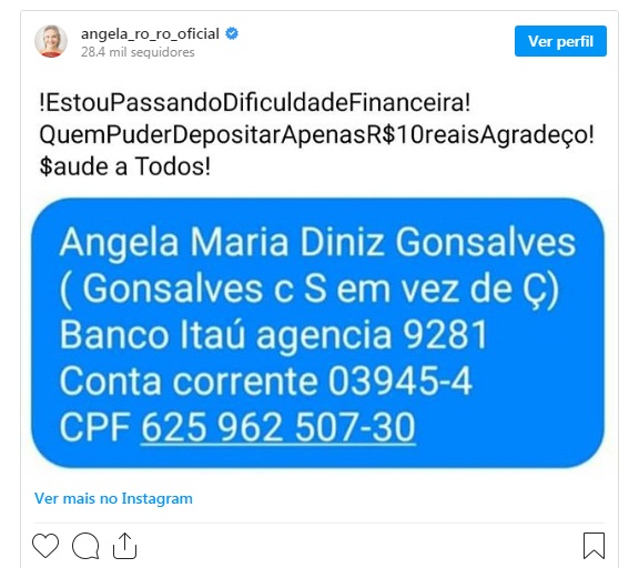 “Quem puder depositar apenas R$ 10 agradeço!”, escreveu. Em seguida,