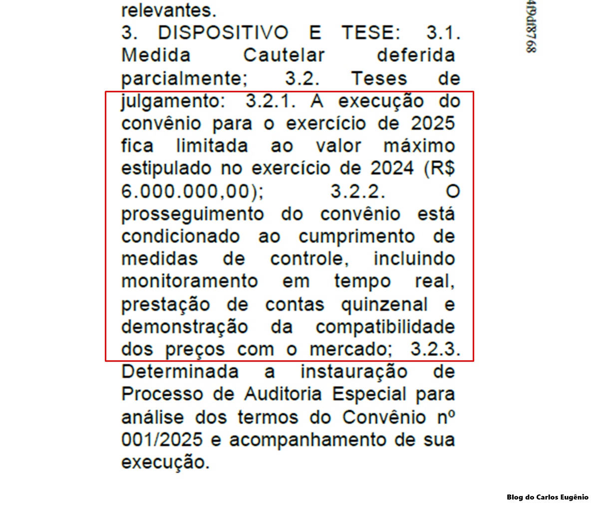O Tribunal determinou que a Prefeitura se limite ao valor aplicado em 2024, de R$ 6 milhões, e estabeleceu medidas de controle rigorosas, como: prestação de contas quinzenal; monitoramento em tempo real dos gastos; comprovação de que os preços estão de acordo com o mercado. Além disso, foi instaurado um Processo de Auditoria Especial para acompanhar a execução do convênio. Saiba mais AQUI. (@blogcarloseugenio, com informações do Blog do Mário Flávio)