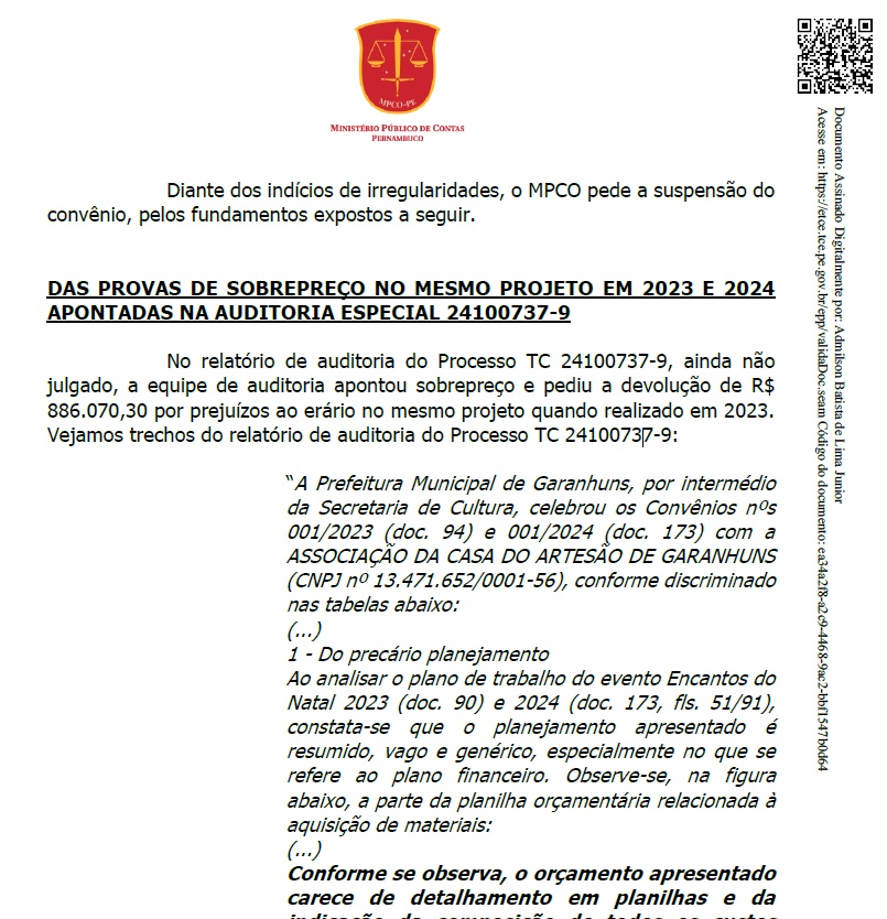 DENÚNCIA DO MPCO-PE – A medida cautelar foi solicitada pelo procurador Cristiano Pimentel, após o MPCO-PE identificar indícios de sobrepreço e falhas de transparência na aplicação de recursos destinados ao evento.