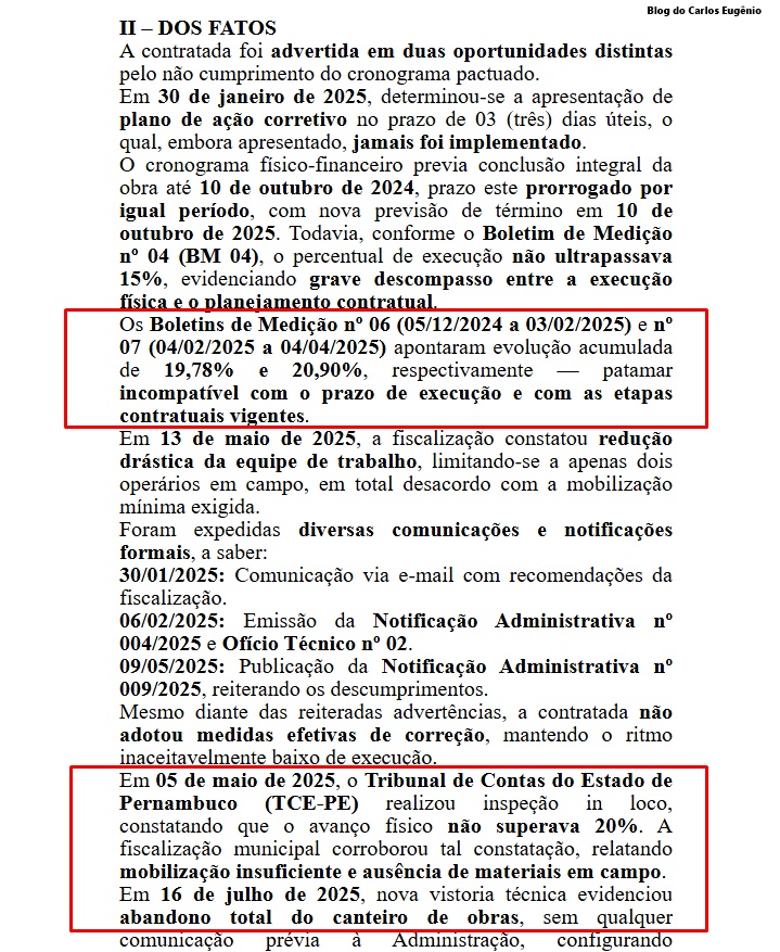 Através de Notificação Administrativa, a Secretaria de Infraestrutura, Obras e Serviços Públicos registrou que a Empresa abandonou o canteiro de obras e descumpriu o cronograma físico-financeiro. O documento cita ainda que, em maio deste ano, o TCE-PE realizou vistoria e confirmou o baixo percentual de execução (20,9%) e a mobilização insuficiente de trabalhadores e materiais. A notificação também menciona que a Empresa foi advertida, mas não apresentou medidas efetivas de correção.