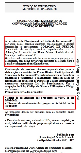 ATUALIZADA EM 2 DE JANEIRO DE 2026 – Depois de vinte e seis meses do lançamento oficial do Processo de Revisão do Plano Diretor Participativo de Garanhuns, iniciativa que só avançou após o Ministério Público de Pernambuco (MPPE) ingressar com uma Ação Civil Pública na Justiça, a Prefeitura de Garanhuns publicou nova medida relacionada ao tema. Por meio da Secretaria de Planejamento e Gestão, o Município lançou, pela terceira vez em poucos dias, convocação para apresentação de Cotação de Preços com o objetivo de contratar serviços técnicos especializados para a elaboração da revisão do Plano Diretor.