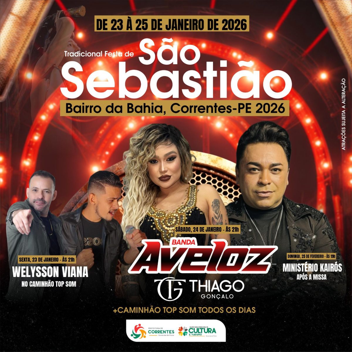Nesse sábado, dia 24, também às 21h, sobem ao palco a Banda Aveloz e o cantor Thiago Gonçalo. A programação será encerrada no domingo, dia 25, a partir das 19h, com a apresentação do Ministério Kairós, logo após a Missa de encerramento dos festejos.