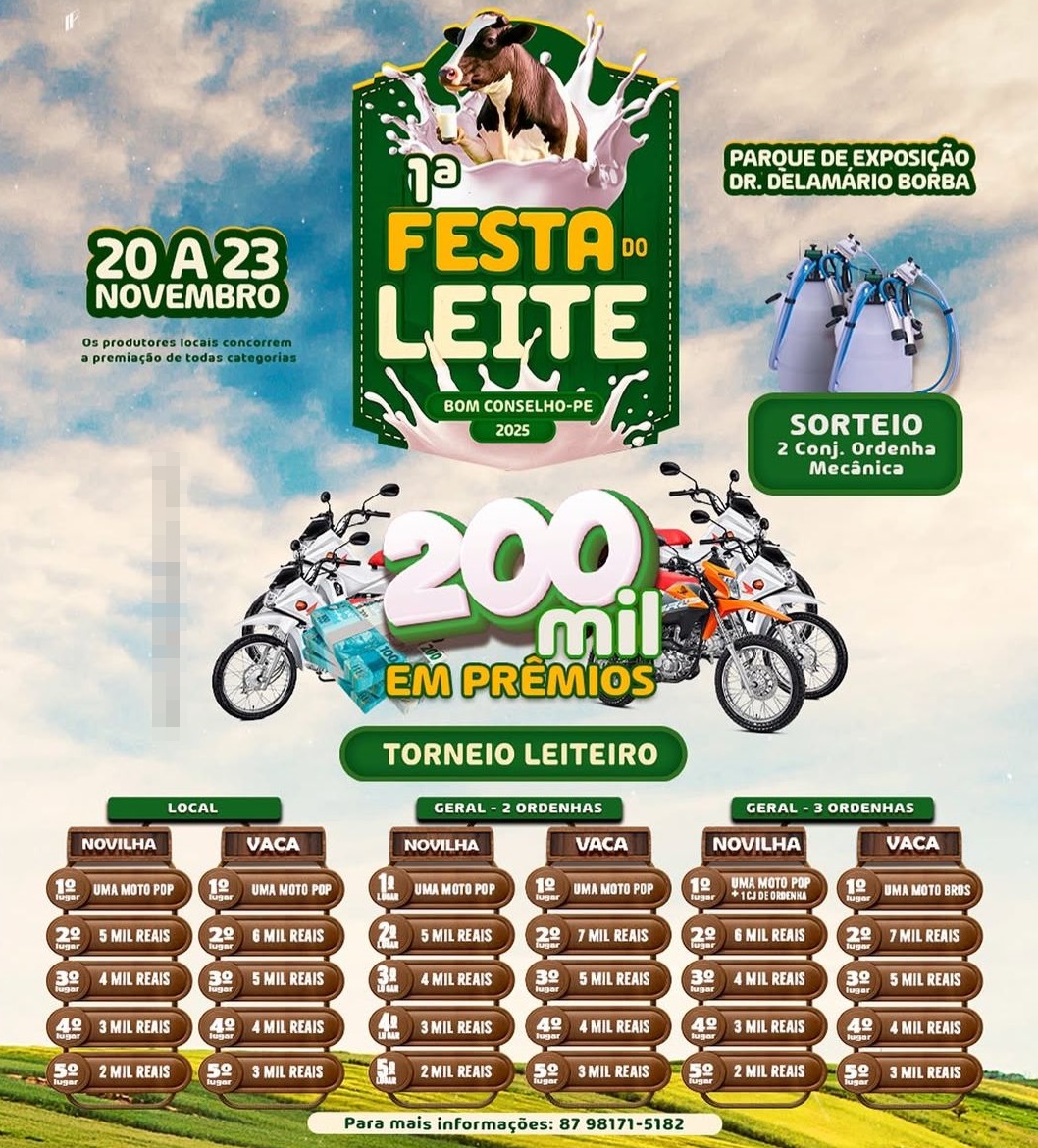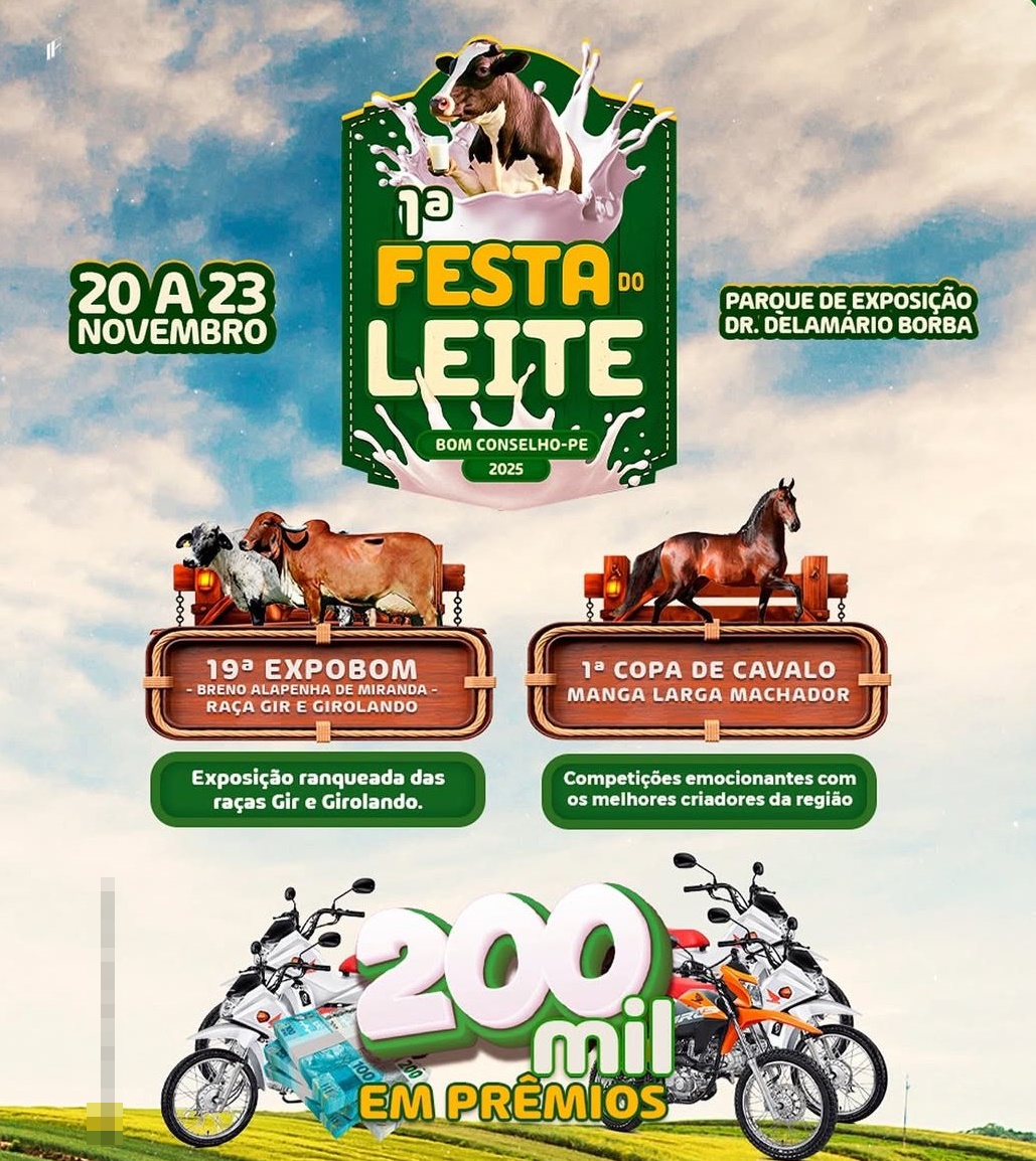 O município de Bom Conselho se prepara para sediar, de 20 a 23 de novembro, a 1ª Festa do Leite, evento que promete movimentar o Agreste Meridional e valorizar o trabalho dos produtores rurais da Região.