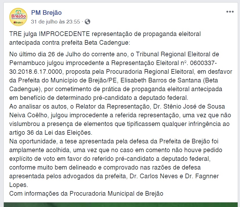fecebook, “a tese apresentada pela defesa da Prefeita de Brejão foi amplamente