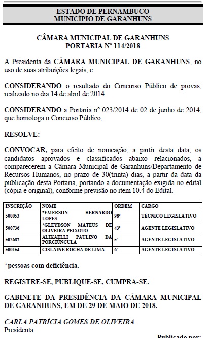 dia 30, a Portaria nº 114/2018, que convoca, para efeito de nomeação, quatro