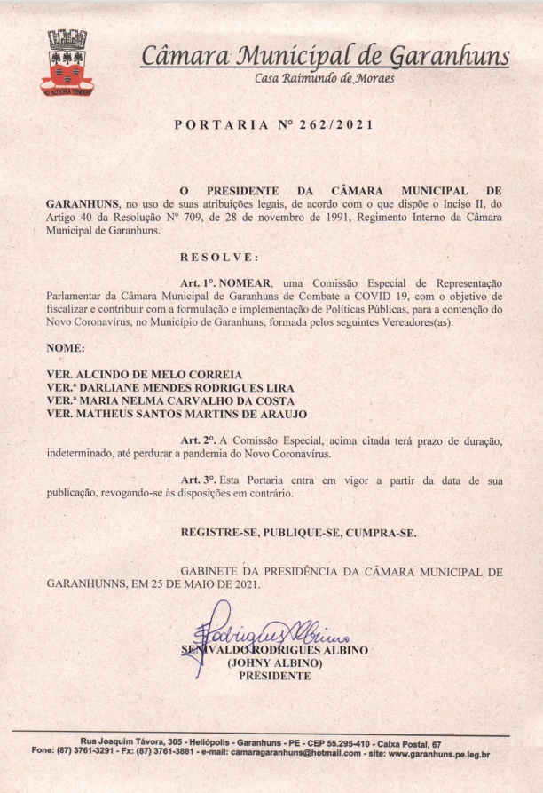 Através da Portaria nº 262/2021, o Presidente da Câmara