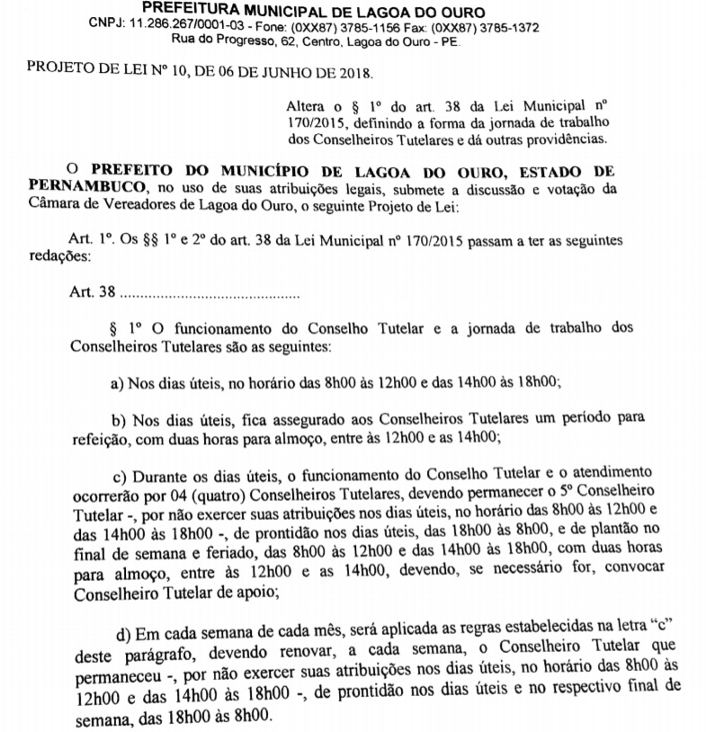 Conselho Tutelar e a jornada de trabalho dos Conselheiros de Lagoa do Ouro