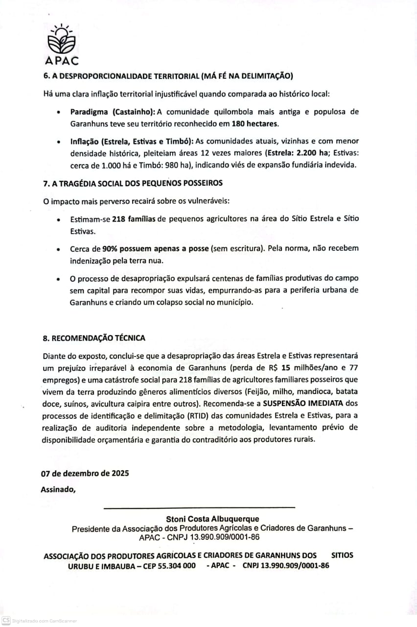 Embora não tenham comparecido à Audiência, lideranças quilombolas afirmaram, em contato com o Blog do Carlos Eugênio, que a regularização fundiária é legítima, prevista na Constituição Federal e essencial para assegurar a permanência das comunidades tradicionais em seus territórios históricos. Em texto divulgado no site oficial, a Coordenação Nacional de Articulação das Comunidades Negras Rurais Quilombolas (CONAQ) manifestou repúdio à atuação do INCRA em Pernambuco e alertou para os riscos enfrentados pelas lideranças de Garanhuns (saiba mais clicando AQUI).