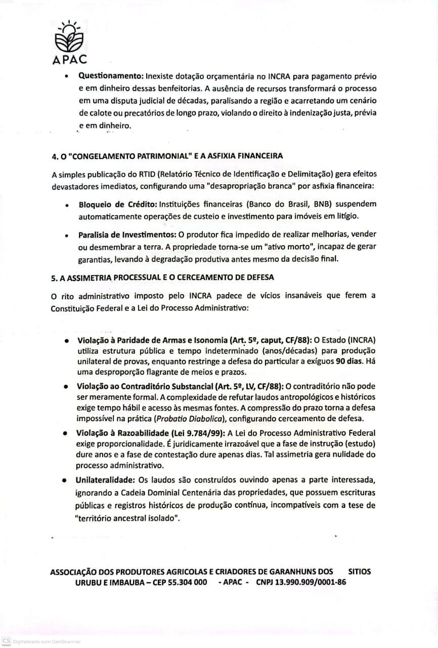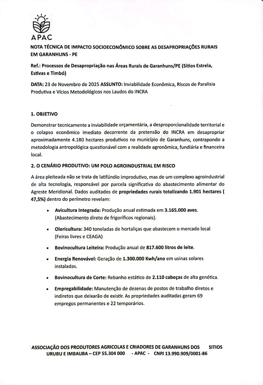 A Nota Técnica alerta, ainda, para possíveis efeitos imediatos do RTID, como o bloqueio de créditos rurais por instituições financeiras e a consequente impossibilidade de investimentos, o que poderia “asfixiar” financeiramente os produtores e comprometer a produção. O documento também aponta impactos sociais, especialmente sobre 218 famílias de pequenos posseiros, muitas das quais não possuem escritura e, portanto, não teriam direito a indenização pela terra nua, segundo a legislação vigente.