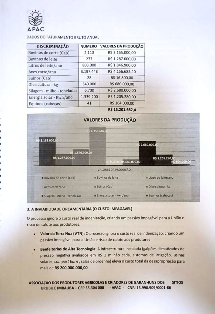 Stoni argumentou que as indenizações previstas pelo Governo Federal não correspondem ao valor real das propriedades e podem causar prejuízo irreparável às famílias que ocupam as terras há gerações. O documento apresentado pela Associação também reforça que a área em estudo compreende um polo agroindustrial de alta produtividade.
