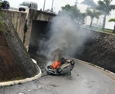 Veículo e colidiu na mureta do viaduto. Devido ao forte impacto, o Carro rodou