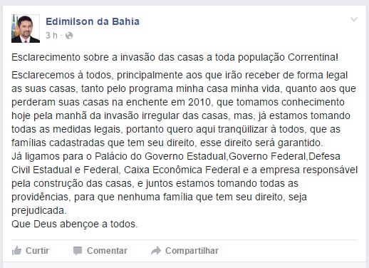 perfis no facebook, o Prefeito Edimilson da Bahia (PSB) registrou que vem