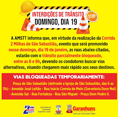 O Calendário de Corridas começa já no próximo domingo, dia 19, com as 2 Milhas de São Sebastião. Em sua terceira edição, a Corrida homenageia o Padroeiro da Boa Vista e tem um percurso de 3,2 quilômetros. A concentração da Corrida acontece a partir das 7h30min em frente à Igreja de São Sebastião e a largada está marcada para às 8 horas. A prova realizada pela Bingo Corridas e Paróquia de São Sebastião, conta com o apoio do Governo Municipal de Garanhuns, através da AMSTT e das Secretarias de Juventude, Esportes e Lazer e de Saúde.