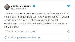 foi ao Facebook e ao Twitter se explicar a decisão a respeito do Fundo Especial de Financiamento de Campanha (FEFC), o “Fundão
