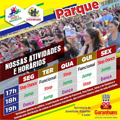 Ginástica (Aeróbica e Localizada); Step; Step Dance e Jump, além da realização