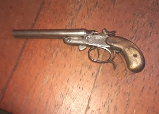 cor vermelha, e placas PFJ-5663, além da arma de fogo (tipo garrucha), usada no