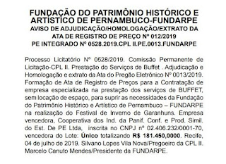 homologada, pelo preço de R$ 181 mil reais, pelo presidente da FUNDARPE,