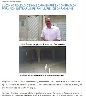 empresa que irá administrar todas as feiras de Garanhuns é só de fachada”, publicou o jornalista Roberto Almeida, em seu Blog, ao abordar o assunto.
