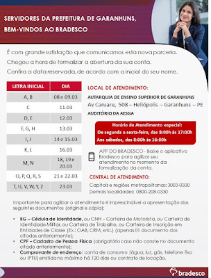 atendimento, o servidor pode acessar o link: https://www.bradescopoderpublico.com.br/prefeituradegaranhuns/index.shtm e