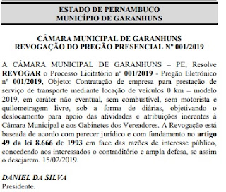 licitação da Câmara Municipal de Garanhuns feita este mês por aquele órgão de
