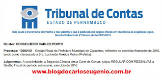 também recomendou a rejeição por parte da Câmara de Vereadores. As contas de
