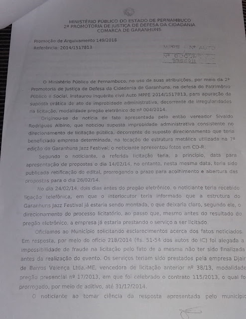 Ministério Público de Pernambuco resolveu arquivar um Inquérito Civil que