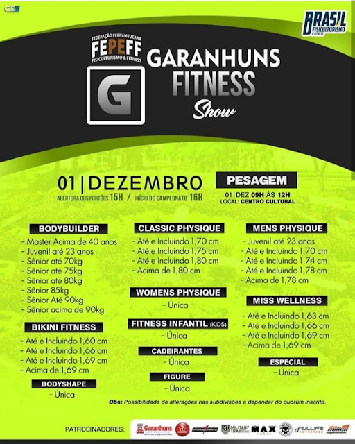 Wellness e Especial). O Evento será iniciado com a pesagem as 9h, seguindo com