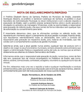 O Governo Municipal de Brejão, que inclusive foi notificado pela Justiça Eleitoral a respeito do áudio, emitiu uma Nota Oficial