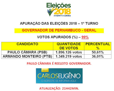 comandar Pernambuco novamente pelos próximos quatro anos. Apuradas 100% das