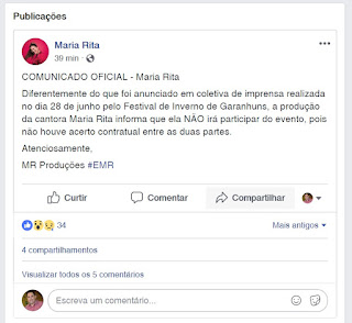 Garanhuns, a produção da cantora Maria Rita informa que ela NÃO irá participar