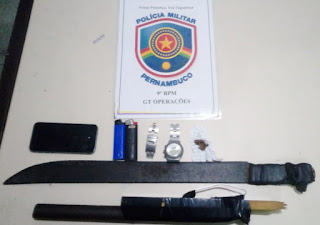 Santos, a PM encontrou o celular roubado; um relógio de pulso Swatch; um facão;