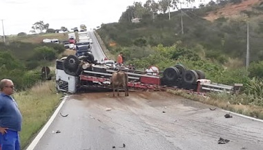 carro de passeio ficou destruído e o caminhão capotou deixando o caminhoneiro