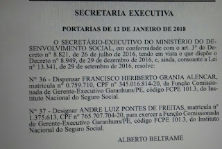 o Gerente Executivo do INSS Garanhuns. A Dispensa do Cargo Comissionado foi