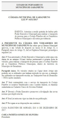 Patricia (PTB), promulgou a Lei Municipal nº 4.431/2017, que autoriza a cessão gratuita de ônibus pelo Poder
