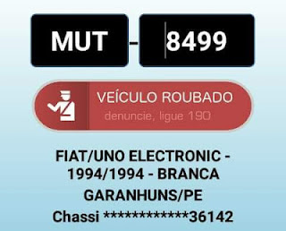 Uno, ano 1994, de cor branca e placas MUT 8499, de Garanhuns-PE. O Veículo estava estacionado