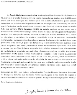 Maria, enviou relato, juntamente com documentos, aos meios de comunicação de Garanhuns, em que registra não ter cometido a agressão ao menor. “Há nove anos desempenho
