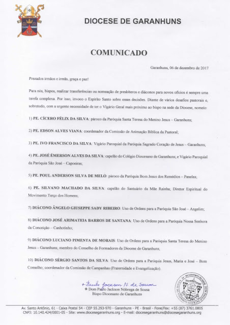 Jackson promoveu a mudança de funções de alguns Sacerdotes da Diocese de Garanhuns.