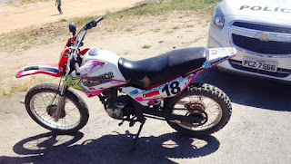 motocicleta sem placa, adesivada para Corridas de Trilha, quando o piloto