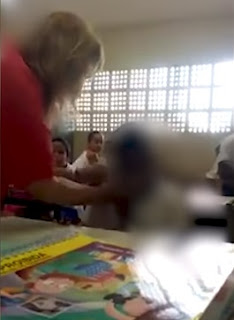 Uma mulher, que aparenta ser professora, grita com um aluno dentro da sala de