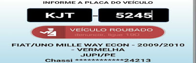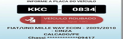tomaram de assalto seu veículo Fiat Uno, de cor cinza, e placa KKC-0834/PE. O assalto aconteceu por volta das 22h da