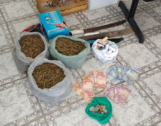foram apreendidos 3 kg de maconha, além de 34 papelotes perfazendo 3,066 kg. R$