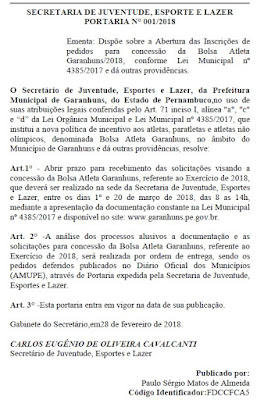 das inscrições de pedidos visando a concessão da Bolsa Atleta Garanhuns/2018.